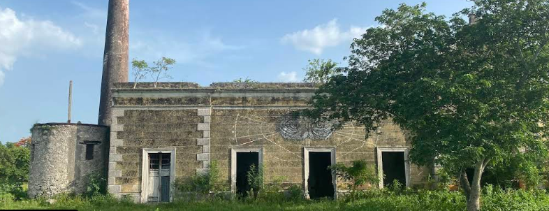 El cuarto de máquinas, corazón industrial del recinto, todavía conserva la estructura donde las potentes desfibradoras separaban la fibra de la pulpa del agave. Es fácil imaginar el estruendo de la maquinaria y el movimiento constante de los trabajadores bajo el sol inclemente de Yucatán. La chimenea, que se alza hacia el cielo como un obelisco industrial, sigue siendo el punto de referencia visual que domina el paisaje, recordándonos el pasado productivo del lugar.